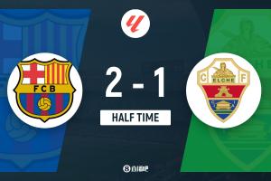 上半场伤停补时3分钟,半场结束,巴萨暂2-1埃尔切。